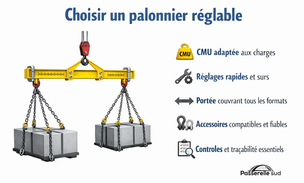 La portée correspond à la distance entre les points d’accroche. Elle doit couvrir la largeur minimale et maximale des charges à manipuler. Un palonnier réglable est pertinent si vous alternez entre plusieurs formats : vous modifiez la position des points de prise plutôt que de changer d’accessoire.