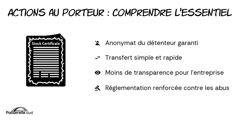 Une action au porteur est un titre financier anonyme qui représente une part de propriété dans l’entreprise émettrice, sans que le nom du détenteur du titre ne soit mentionné sur le document lui-même ni enregistré par l’émetteur. Ce qui garantit l’anonymat du propriétaire. La possession de l’action est l’unique condition nécessaire pour exercer les droits qui y sont attachés, comme le droit de vote en assemblée générale et le droit aux dividendes. La transmission des actions au porteur peut se faire de manière très simple, par la remise matérielle du titre, simplifiant ainsi les transactions entre parties.